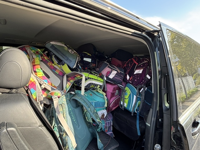 In den vergangenen Wochen hatten Schülerinnen und Schüler, Eltern und Lehrkräfte fleißig mitgeholfen, nicht mehr benötigte, aber gut erhaltene Schulranzen zu sammeln. Das Ergebnis kann sich sehen lassen: Ein ganzer Transporter voller bunter Ranzen machte sich nun auf den Weg zu „Care for Kids“.