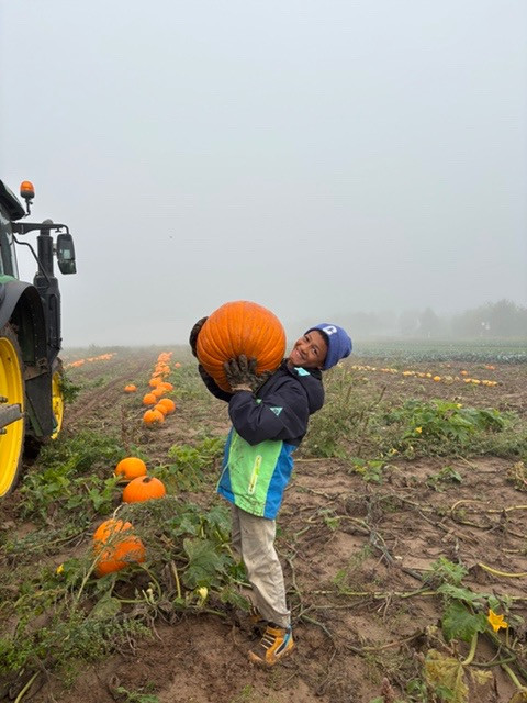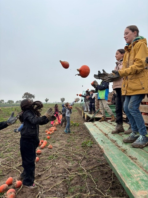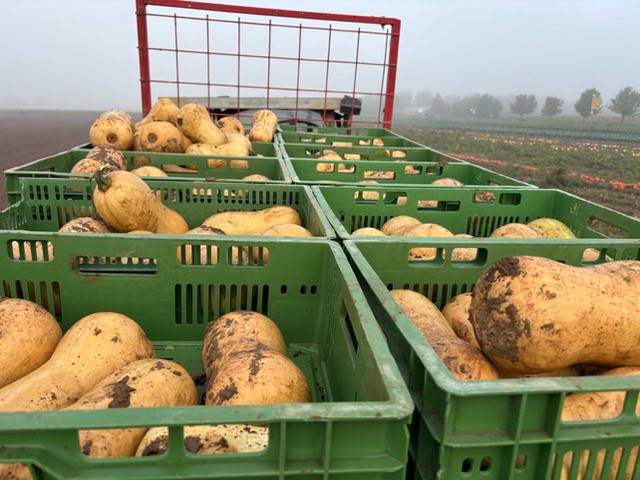 In diesem Jahr stand zunächst die Ernte der Halloweenkürbisse auf dem Programm – rund 35 Kubikmeter dieser großen Exemplare, die jeweils etwa 8 bis 10 Kilogramm wiegen. Anschließend folgten die Butternut-Kürbisse, die von den Schüler*innen sorgfältig in 122 Kisten mit jeweils 7 bis 8 Kürbissen gepackt wurden.