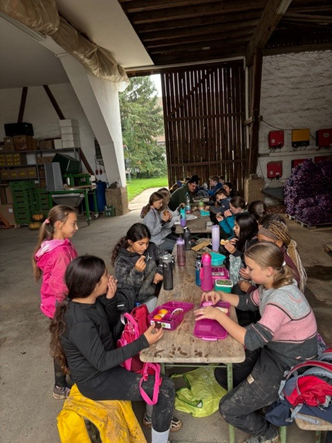 Nach dieser intensiven Arbeit war eine Pause wohlverdient. Die Klasse wurde mit frischen Äpfeln und selbstgepresstem Apfelsaft vom Hof versorgt – eine leckere Stärkung nach getaner Arbeit.