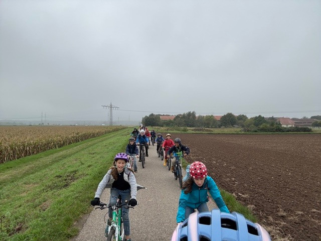 Der zweite Teil des Tages brachte besonders viel Spaß: Die Hokkaidokürbisse durften geerntet – und sogar geworfen – werden. Mit viel Motivation und Teamarbeit war das Feld bald abgeerntet. Zum Abschluss durfte sich jeder Schülerin einen Kürbis für zu Hause aussuchen. Nachdem Kürbisse und Schuhe vom Schlamm befreit waren, radelte die Klasse zufrieden und ein wenig müde, aber glücklich zurück.