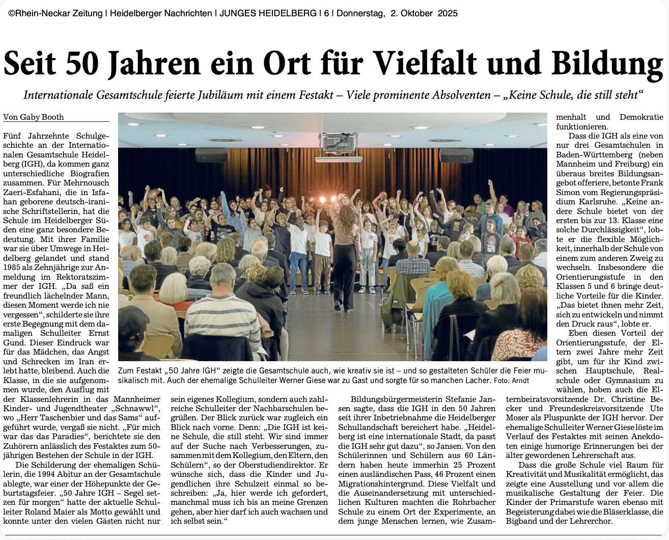 Auch unsere ehemalige Kollegin und stellvertretende Orientierungsstufenleiterin, Marlis Kopp, ist vor Kurzem verstorben (03.10.2025). Sie kam 1992 an die IGH und war von 2011 bis zu ihrer Pensionierung 2017 stellvertretende Leiterin der Orientierungsstufe. Wir werden sie mit ihrer offenen Art, ihrem empathischen Wesen und ihrem Humor in guter Erinnerung behalten.