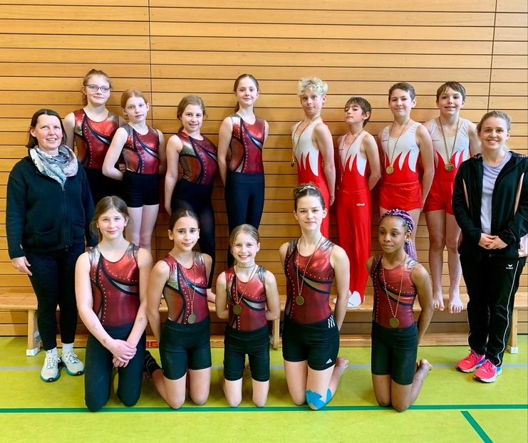 Unsere Mädchen gingen mit zwei Mannschaften an den Start. Das erfahrene Team um Lina, Line, Victoria und Gulieta vergab durch einen taktischen Schnitzer sogar noch die Silbermedaille, belegte Platz 3. Gulieta turnte fehlerfrei und auf hohem Niveau und konnte auf Platz 5 sehr viele Vereinsturnerinnen hinter sich lassen.